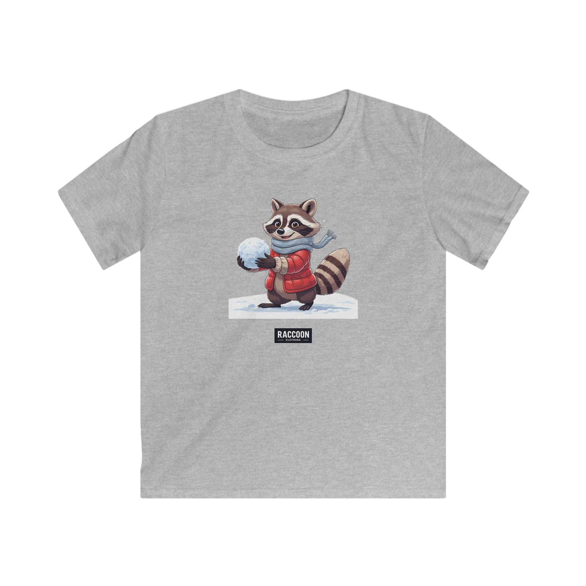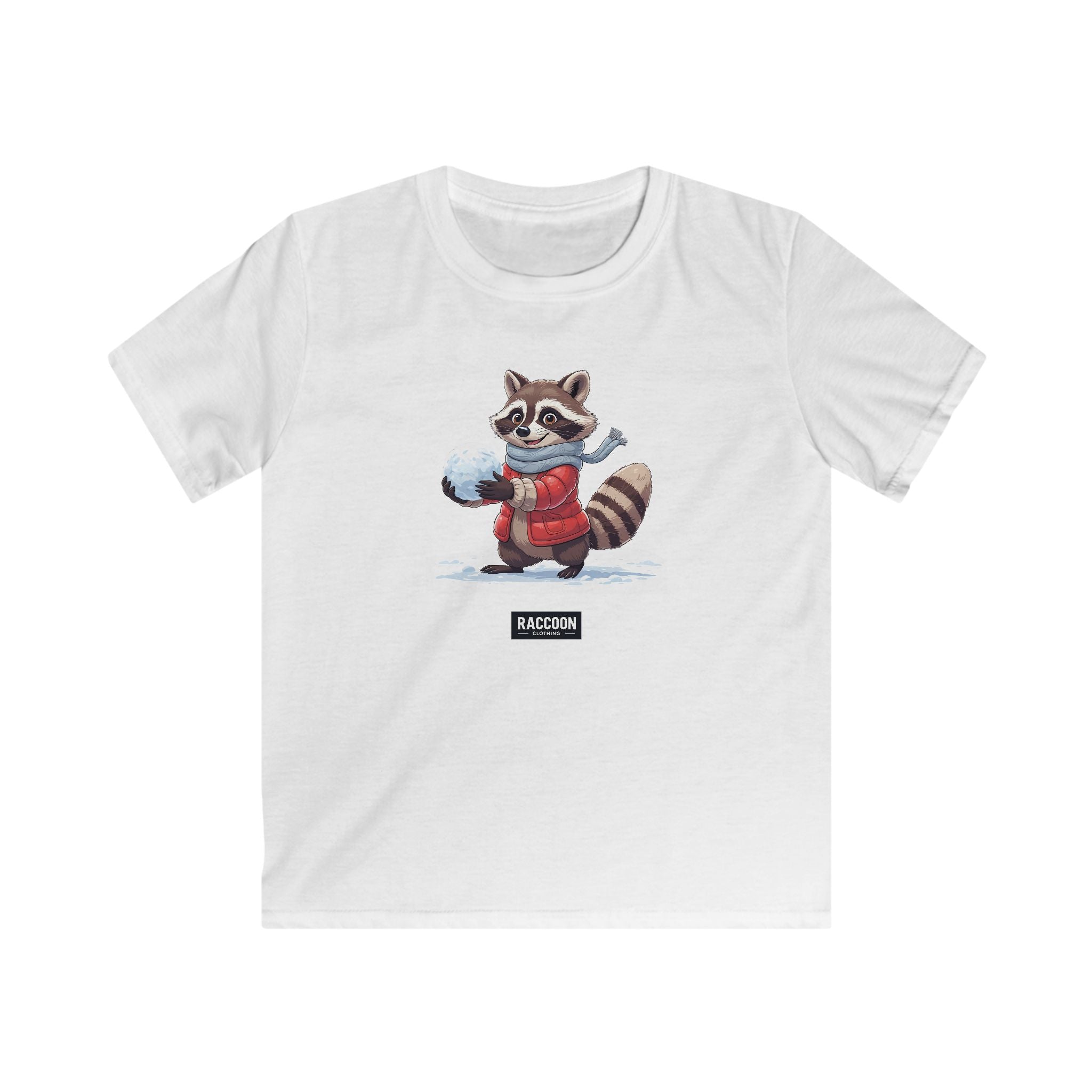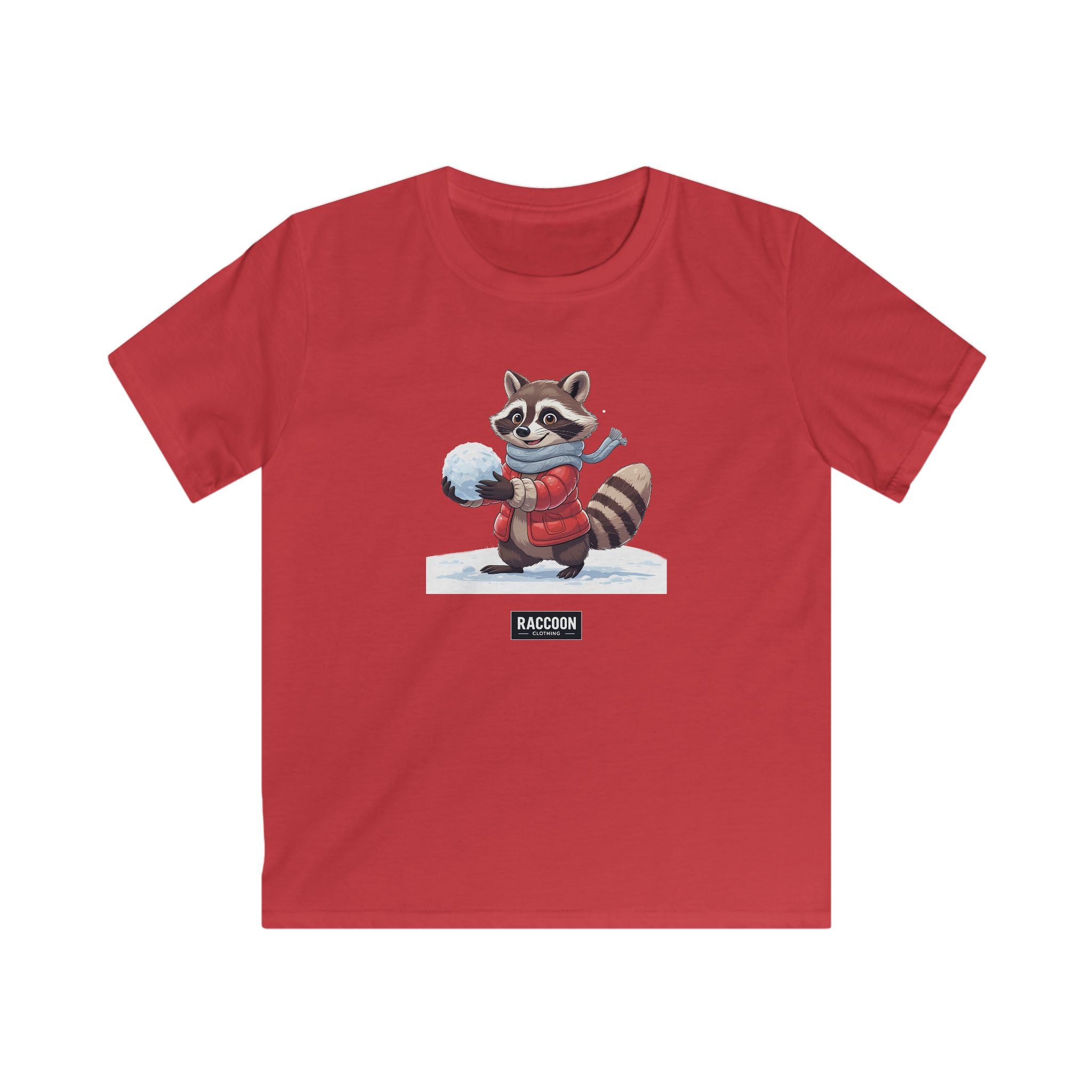 This adorable raccoon, dressed in a cozy red jacket and scarf, is ready for winter fun with a snowball in...